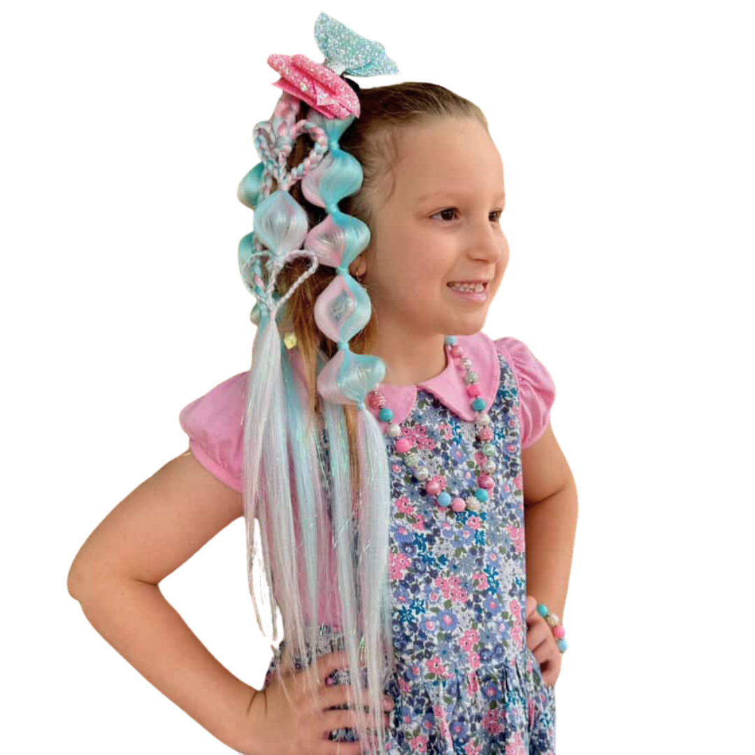 A mix of bubbles, love hearts & plaits ‘The 5 minute braid’ is so easy to use with hair attached to a strong hair band