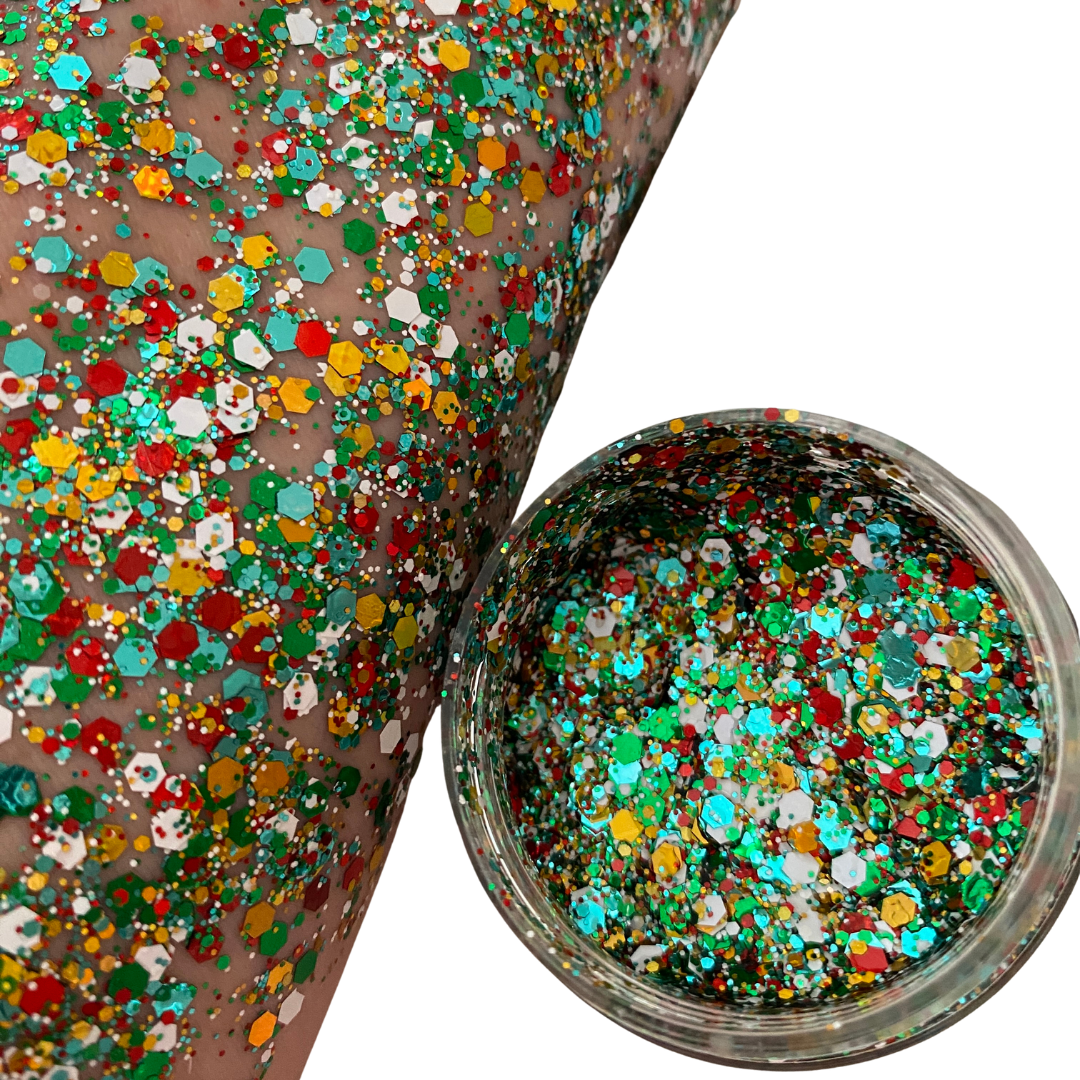 A few different shaped glitters makes it super sparkly, long lasting but easy to wash off using soap or shampoo.