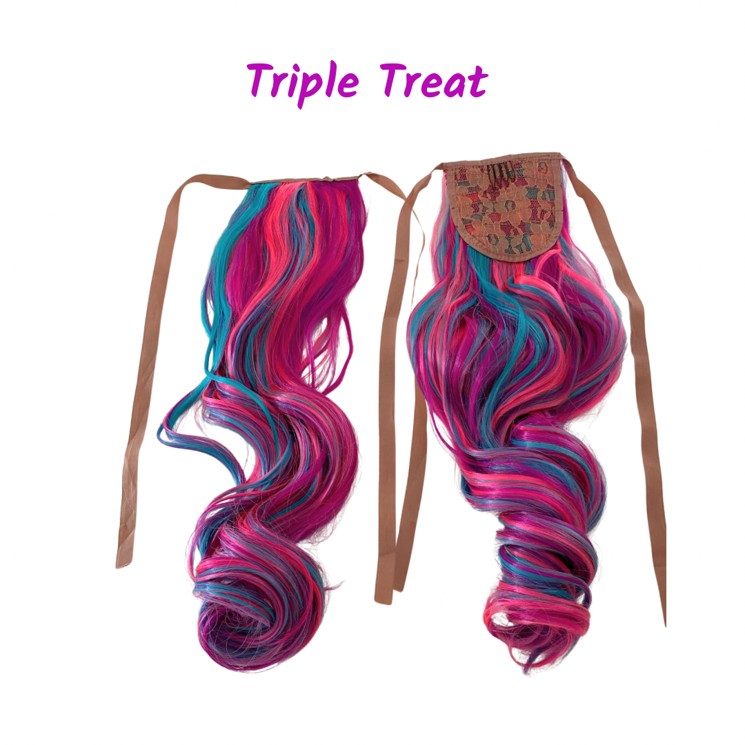 This tie in extension is different to our other pieces, it is on a weft of hair 100g of synthetic wavy hair. Thicker our other ponys